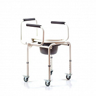 - Четыре колеса с тормозами. Конструкция позволяет быстро перемещать кресло-туалет по комнате, а также отвозить человека в ванную.