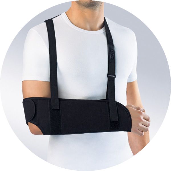 Универсальный бандаж для поддержки правой/левой руки. Основа из плотного полотна, разъемная в области локтевого сустава, усилена моделируемым ребром жесткости. Бандаж снабжен системой ремней-подхватов с регулировкой длины и муфтой для снижения давления в области шеи. Фиксация бандажа осуществляется с помощью застежек «велкро».