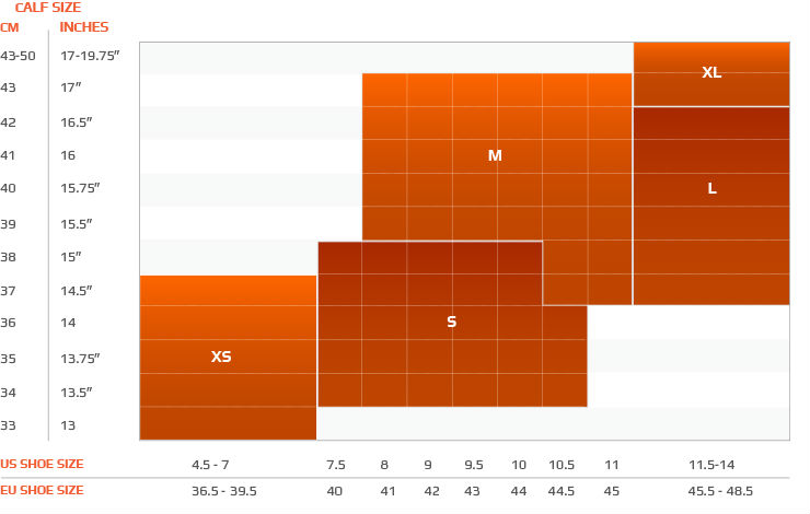 Подобрать нужный размер вы можете подобрать по обхвату голени (Calf Size) и размеру стопы (Shoe Size)